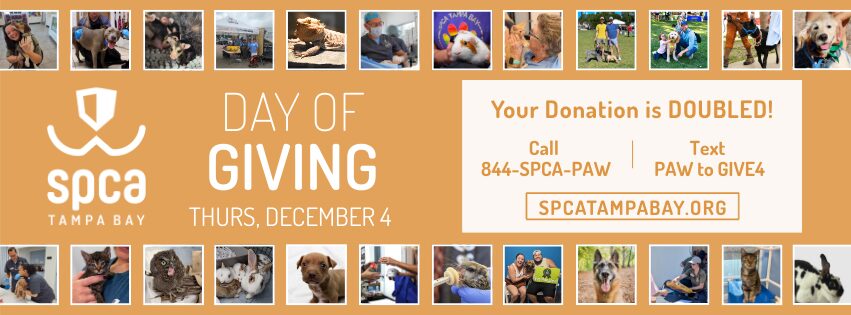 All donations made during SPCA Tampa Bay’s Annual Giving Campaign will be DOUBLED to support our Tampa Bay community, its pets, homeless animals, and injured wildlife.
