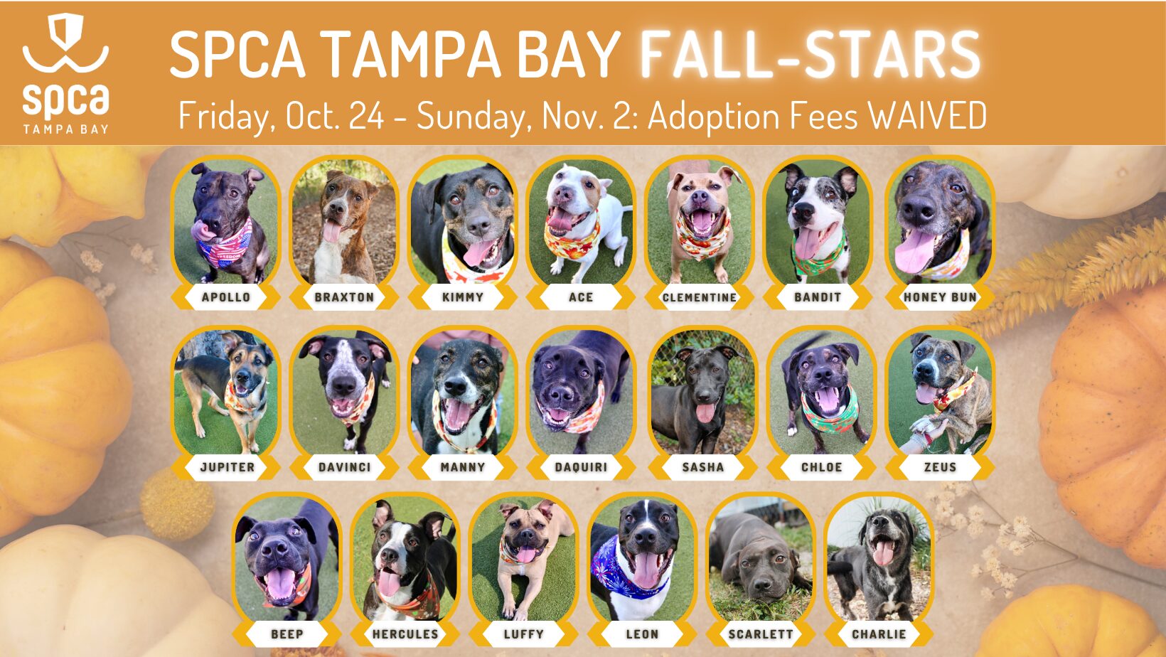 Starting Friday, October 24 through Sunday, November 2, adoption fees will be waived for our “fall”-star dogs!